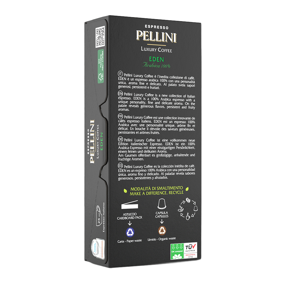 Welcome to the extraordinary world of Eden, a 100% Arabica Espresso that boasts a unique personality and a fine, delicate aroma. This Exclusive PELLINI blend is meticulously crafted to unveil generous, persistent, and fruity flavors that dance on the palate, transforming your everyday ritual into a dream Espresso experience.